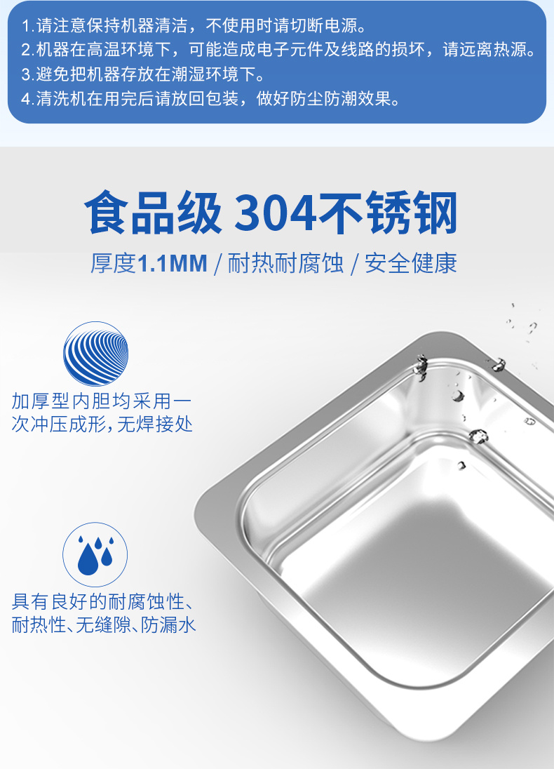• 啟動加熱功能,清洗槽內液體不得低于清洗槽內槽高度的2/3;不開啟加熱功能,清洗槽內液體不得低于清洗植內精高段的1/2。