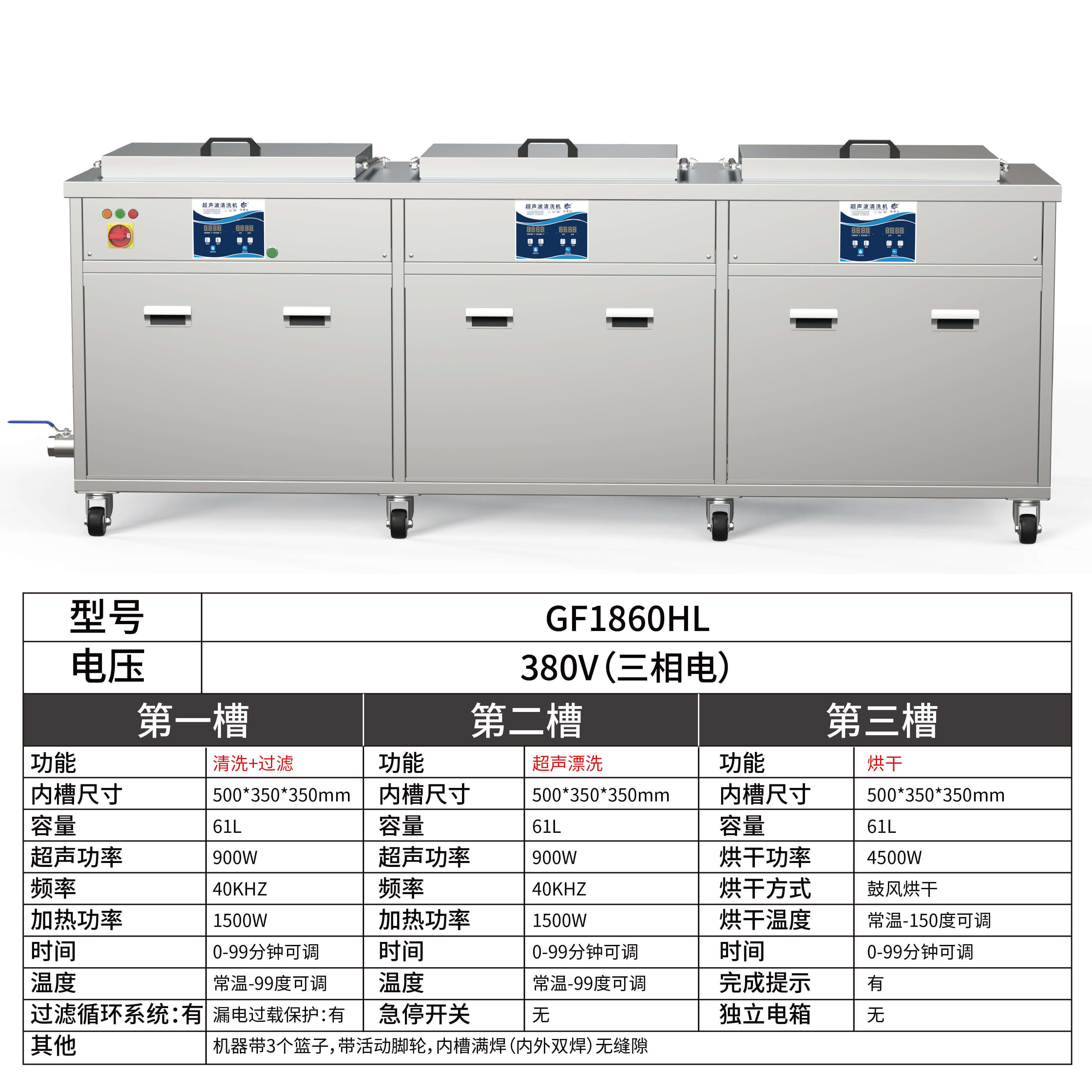 冠博仕GF1860HL三槽超聲波清洗機 | 61L/900W | 工業級過濾漂洗烘干三槽設備用于汽修模具五金除油除銹
