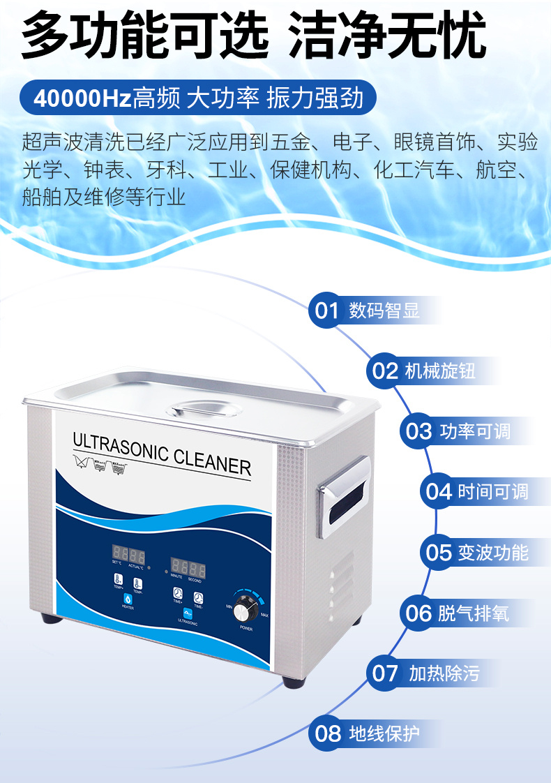 1.家用適用范圍:清潔高檔手表、品牌眼鏡、珠寶首飾等貴重物品和表鏈、水筆、光碟、刮須刀、梳子、牙刷、假牙、 茶具還有奶瓶、 奶嘴具等各類日用品,以及清洗水果、蔬菜、魚肉、碗碟筷等。
