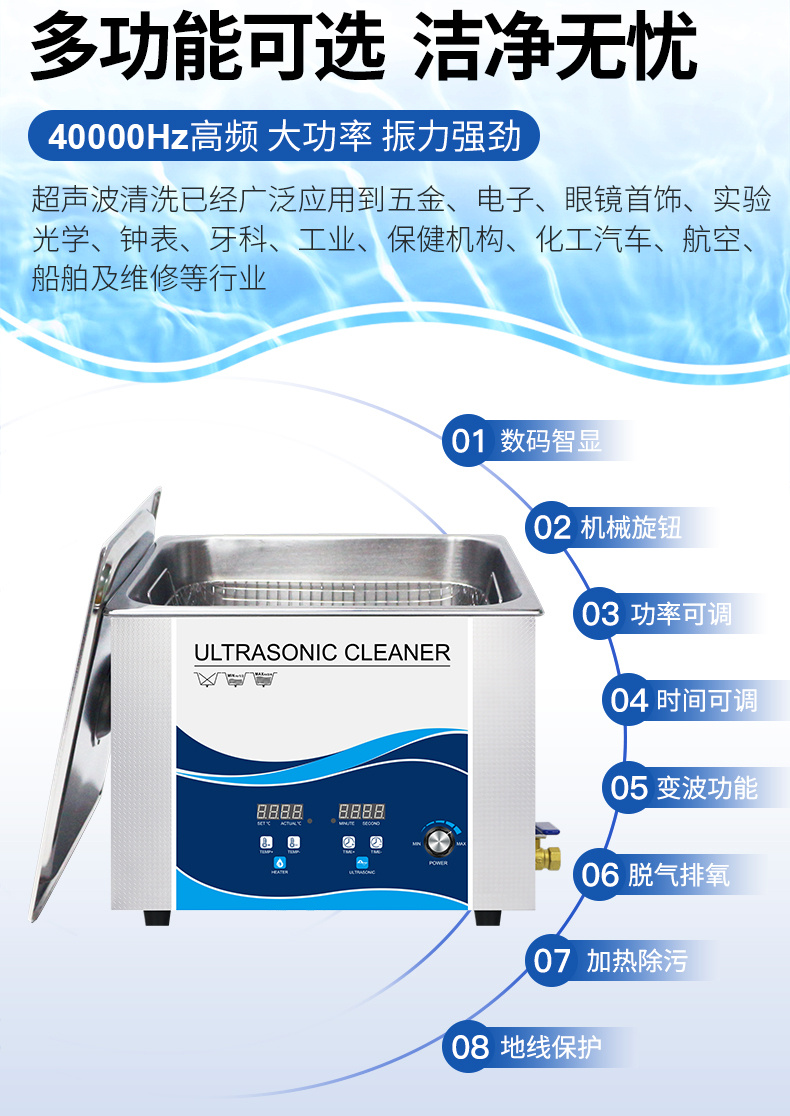 4.實(shí)驗(yàn)室和制藥行業(yè)適用范圍:可清洗各種儀器、容器、燒杯、量具等,此外還可以混勻、促融、乳化、萃取等。